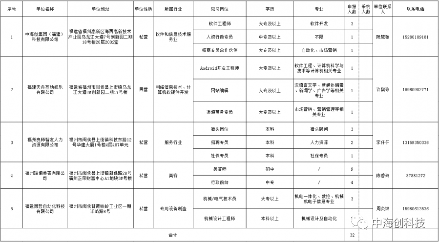 据了解,2020年第四批青年见习岗位32个,供离校2年内未就业大中专(含技校)毕业生和16~24岁失业青年(简称见习人员)参加见习,见习时长为3~12个月。见习期间,见习基地应为见习人员提供必要的见习指导,按月发放生活补助,并为见习人员办理人身意外伤害保险。符合条件的广大毕业生和适龄青年可向企业或高新区人社局劳动保障科报名参加就业见习,进行岗位锻炼,提升就业能力。 ▲福州高新区2020年第四批青年见习岗位 入选福州高新区第四批青年就业见习单位,既是对中海创科技集团肯定也是激励。中海创始终不忘履行作为一个优秀的科技公司的社会责任,在奉献与责任的道路上阔步前行。未来,集团将继续加强就业见习计划,大力引进人才、培养人才,实现企业、毕业生、高校互赢的新好局面,为公司未来的发展奠定坚实的人才基础。